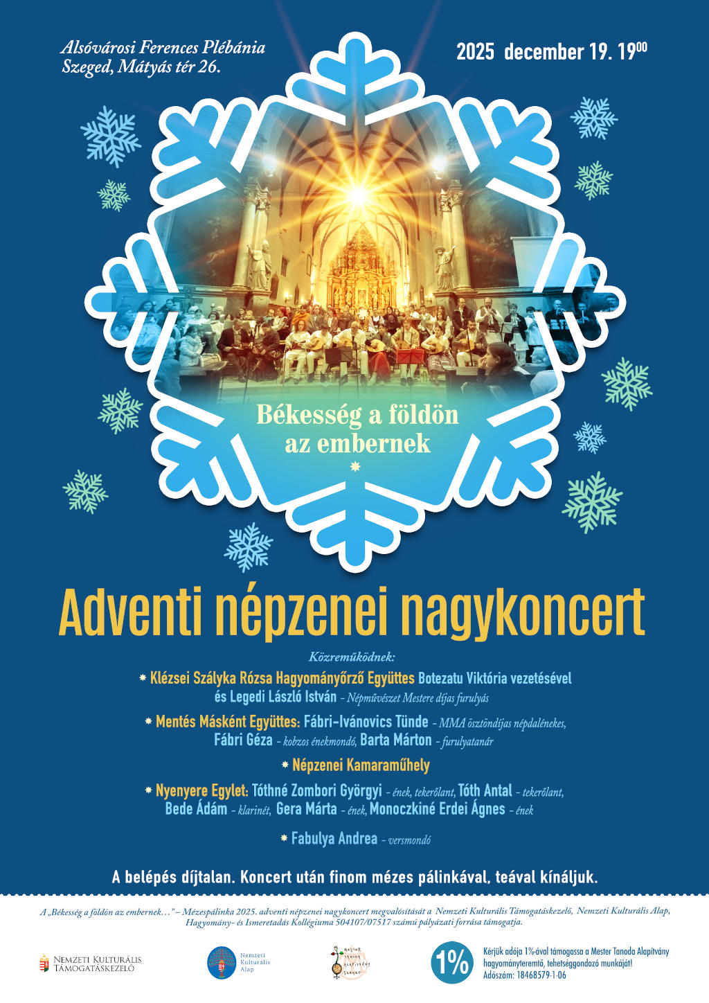 Adventi népzenei nagykoncert Posted on2025.12.11.AuthorKázmér Adventi népzenei nagykoncert lesz templomunkban 2025. dec. 19-én, péntek este 7 órától, melynek keretében kiemelkedő népzenészeket hallhatunk.