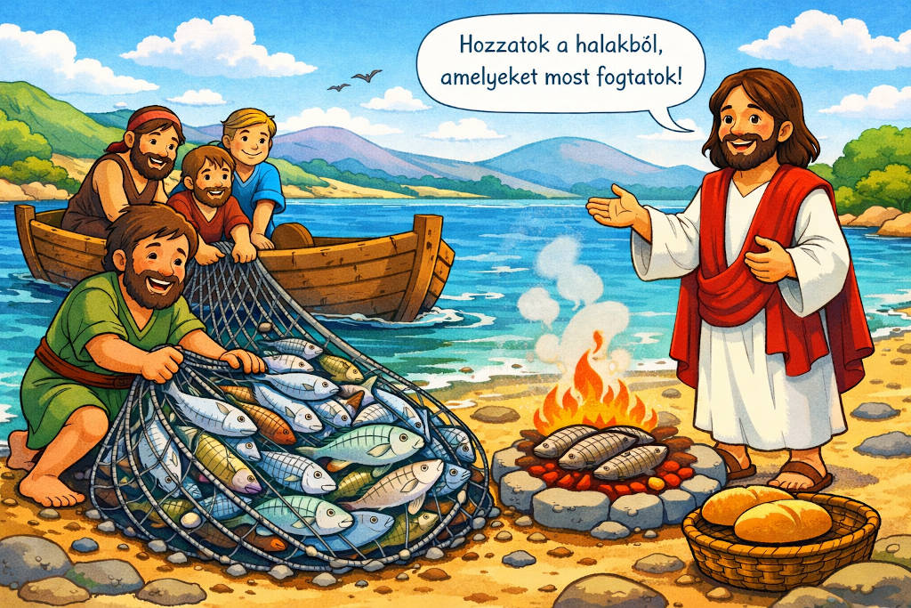 Amikor a sikertelen halászat után a tanítványok üres hálóval elindultak a part felé, az a gondolat járhatott a fejükben, hogy mit fognak most enni. Talán Jézus is tudhatta, hogy mi járhat a tanítványai fejében. Ezért várta őket a parton frissen sült hallal, illetve kenyérrel. De előbb csodával gondoskodott a sikeres halfogásról.