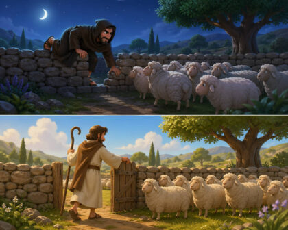 Aztán Jézus ajtóhoz, kapuhoz is hasonlítja magát. Kétszer is mondja, hogy: „Én vagyok az ajtó a juhok számára… Aki rajtam keresztül megy be, az üdvözül, ki- és bejár, s legelőre talál”. Megnevezi a Vele szemben állókat is: „Aki nem a kapun megy be a juhok aklába,… az tolvaj és rabló”. „A tolvaj csak azért jön, hogy lopjon, öljön és pusztítson”.