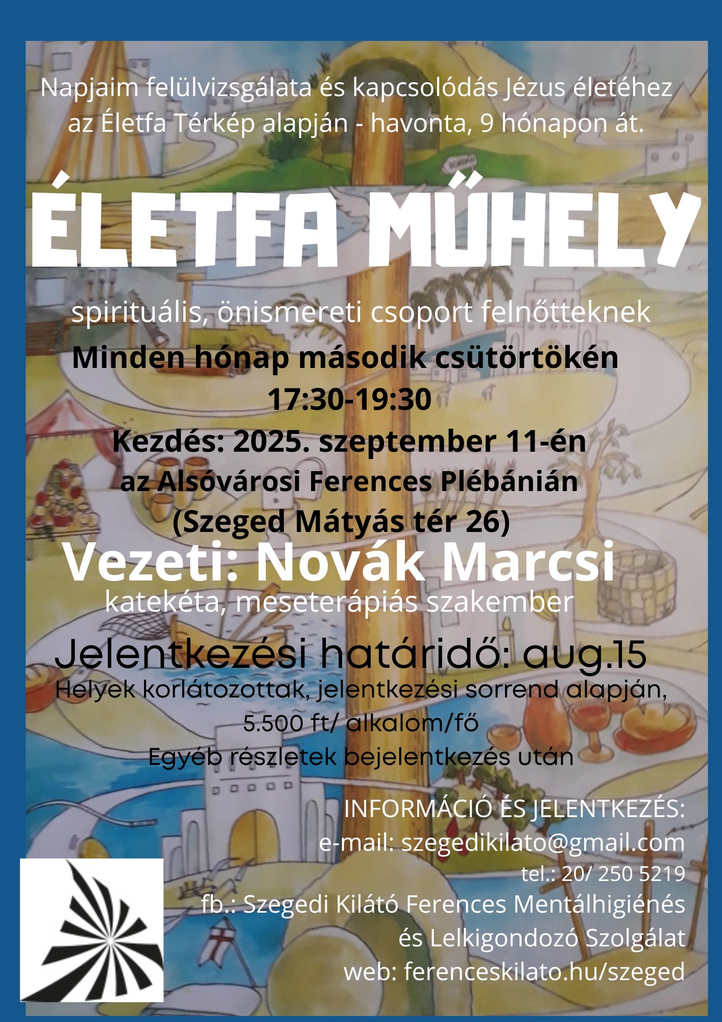 A korlátozott létszámú csoport tagjai 9 hónapon keresztül MINDEN MÁSODIK CSÜTÖRTÖKÖN találkoznak az Alsóvárosi Ferences Plébánián (Mátyás tér 26.) 2025. szeptember 11-ével kezdődően.