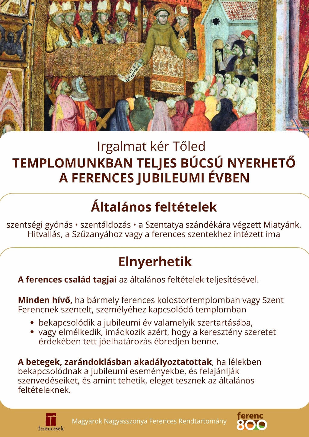 A ferences jubileumi év kapcsán teljes búcsút engedélyezett Leó pápa minden ferences templomnak. Az általános feltételek mellett (szentgyónás, szentáldozás, pápa szándékára végzett imádság) idén az év minden napján teljes búcsú nyerhető templomunkban, ha valaki hívő lélekkel bekapcsolódik valamelyik szertartásba (szentmise, zsolozsma), imádkozik a ferences szentek közbenjárását kérve, és elmélkedik azért, hogy a keresztény szeretet érdekében tett jó elhatározás ébredjen benne. A búcsúnyerés részleteiről készített kis füzetecske ingyenesen elvihető az újságos persely tetejéről és megtalálható ITT. További részletek ITT.