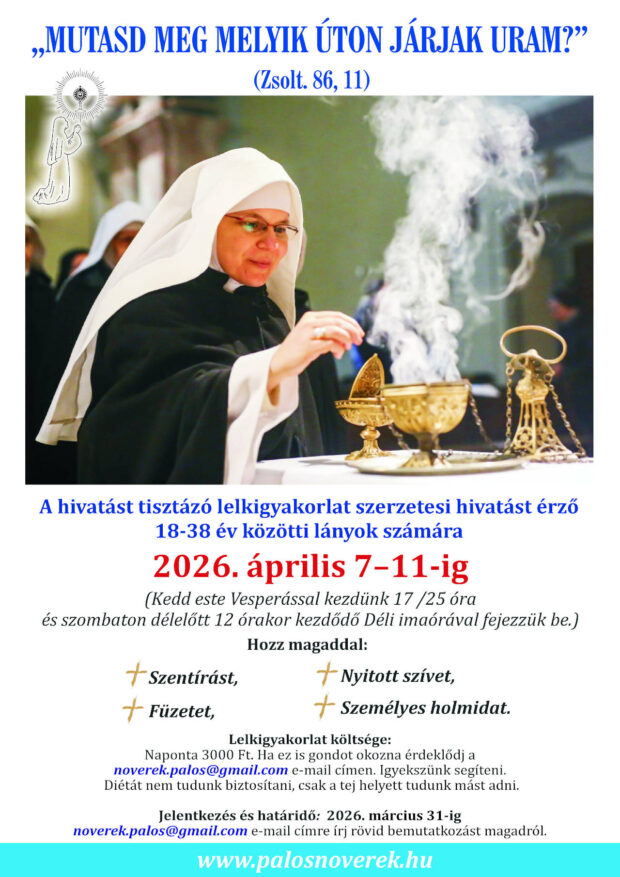 Hivatástisztázó lelkigyakorlatot szerveznek a Pálos Nővérek 18-38 év közötti lányok számára Erdőkürtön 2026. április 7-11 között. Szeretettel várják a szerzetesi hivatás iránt érdeklődő lányokat.