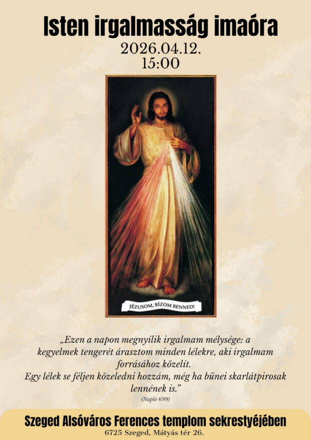 Irgalmasság imaóra Posted on2026.04.04.AuthorKázmér Húsvét utáni vasárnap (ápr. 12.) az Irgalmasság vasárnapja. Ezen a napon Irgalmasság imaóra du. 3 órától kezdődik a kápolnában (sekrestyében).
