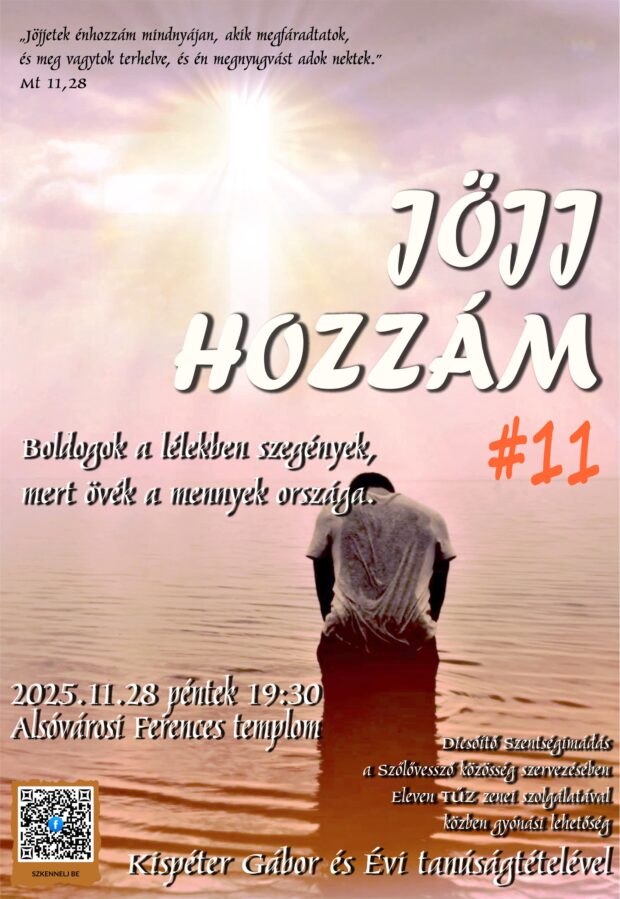 Jöjj Hozzám imaest következő alkalma 2025. november 28-án, pénteken este fél 8-tól lesz a templomban az Eleven Tűz zenekar szolgálatával.
