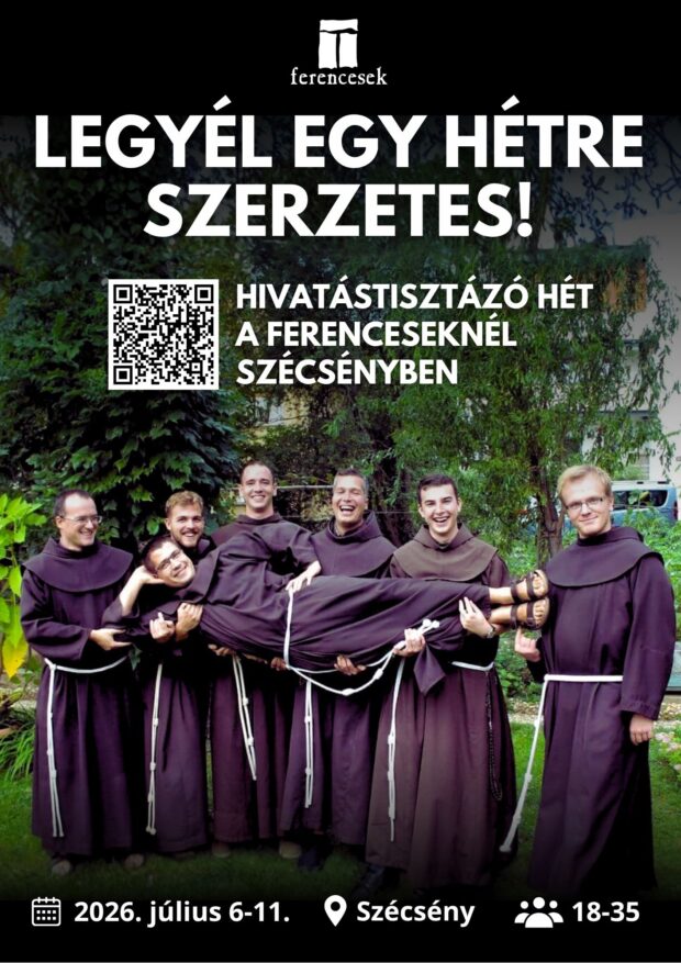 Szeretettel hívjuk azokat a 18 és 35 év közötti fiatal férfiakat a Legyél egy hétre szerzetes hivatástisztázó hétre 2026. július 6-11. között, akiket foglalkoztat a szerzetesi hivatás gondolata, és szívesen beköltöznének a szécsényi ferences kolostorba, hogy bekapcsolódjanak a szerzetesek életébe, imádságába, munkájába.
