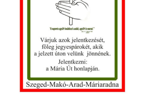 Gyalogos zarándoklat indul templomunktól Máriaradnára 2025. október 2-8 között. Jelentkezési határidő: 2025. augusztus 30. Útvonal: okt. 2. csüt. Szeged- Makó, táv, 34 km. mise: 06.óra, ind.7,15 h. okt. 3. péntek Makó – Nagylak (Ro), 27 km. (Vélhetően, 15 óra a határ átlépés.) okt. 4. szombat Tovább…
